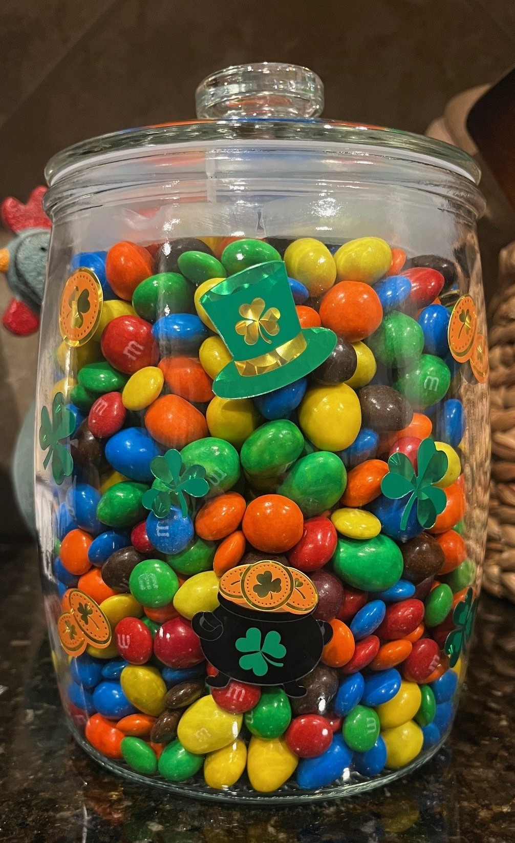 I have a candy jar filled with regular M&M’s, Peanut M&M’s, Almond M&M’s and Peanut Butter M&M’s.